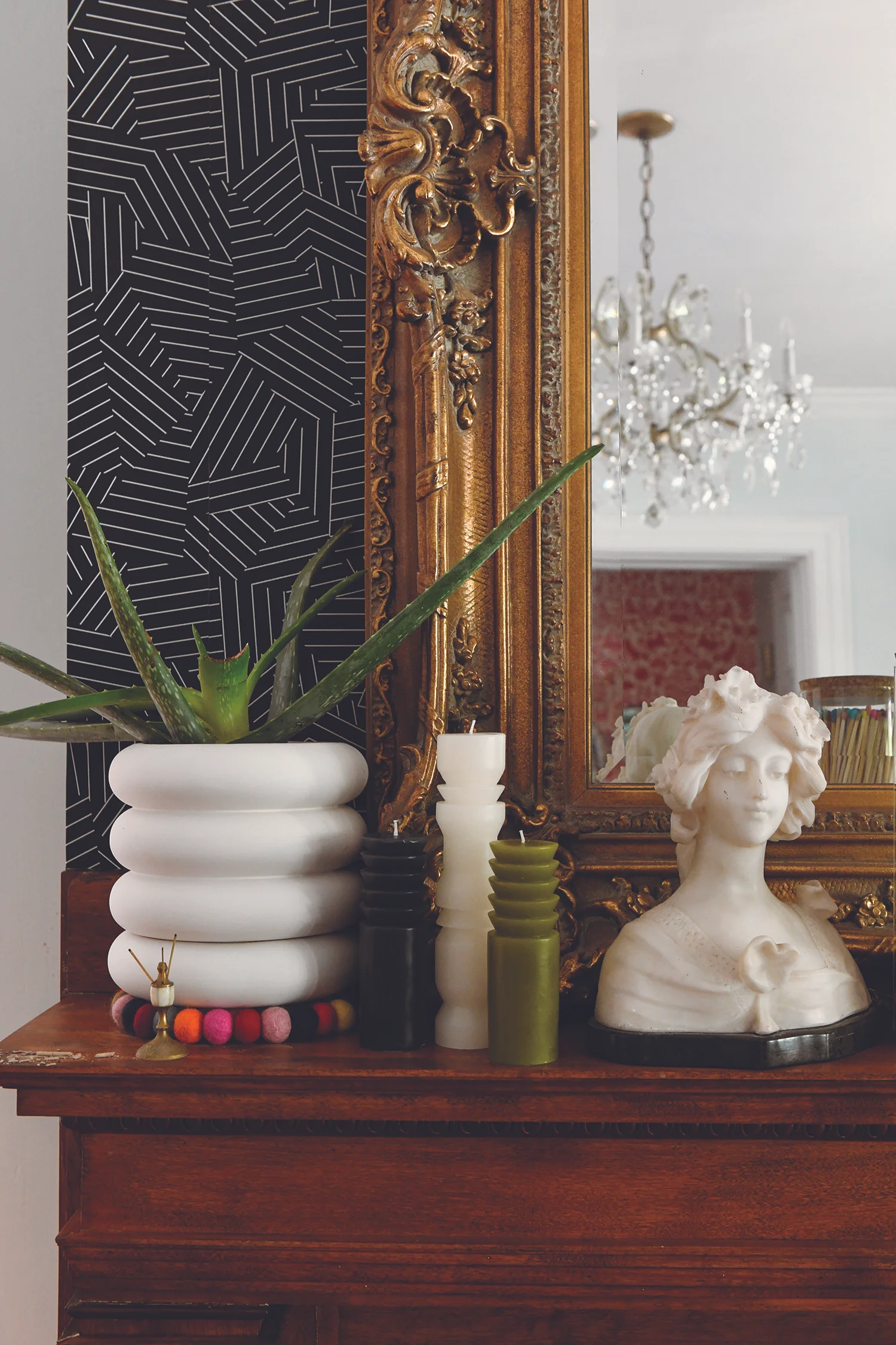 Be loud and proud! It’s the centralist central center of your room, so go for broke. I love a fun modern geo print paper to mess with the old lady lace Victorian architecture in our space, but I like to layer it again with a classic vintage French mantle mirror. 2) Always have an organic element. I think this adds an element of warmth and sincerity. I love the way the rounded edges of these planters soften the hard lines of the built-in elements and the aloe casts a California vibe (that’s what I call it, at least). 3) Do something random and unexpected: something only you “get” or a color or texture only a mother could love. For us, it’s the subtle rainbow felt ball trivet under the plant pots.