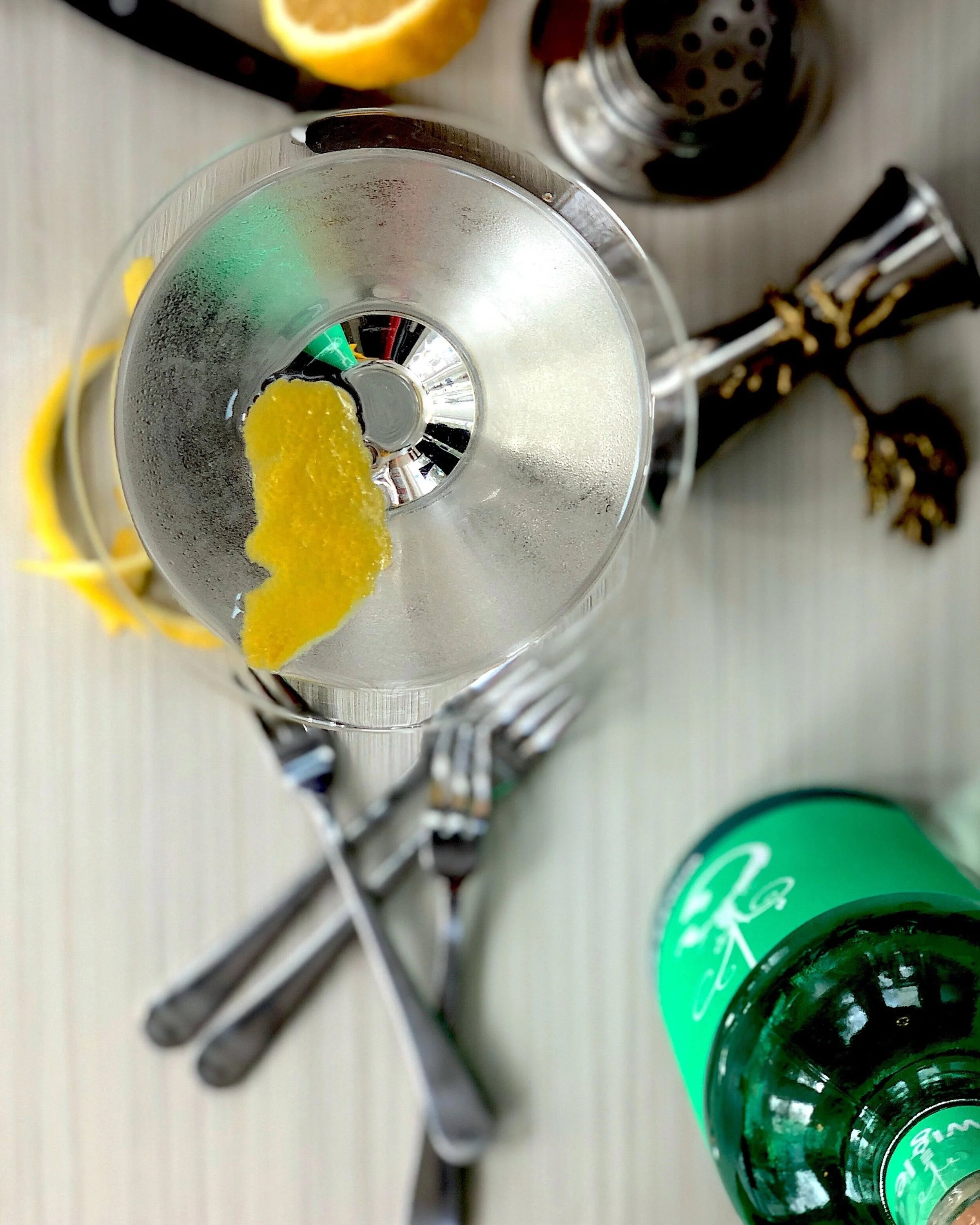 Fill the martini glass with an ice bath by combining ice and water. Let it sit while you mix your drink. Combine Ginvever and ice in a cocktail glass and allow to rest momentarily. Empty ice bath from your martini glass. Add 1 part of dry vermouth to chilled glass. Roll it around to coat the glass, and dump out any excess. Twist lemon rind gently to release citrus oils but do not break it. Run the rind and oils around the rim of the glass to add a bit of lemon essence. Return to shaker and stir for 30 seconds. Pour into your coated glass, and lay your lemon rind on top to garnish. Cheers!