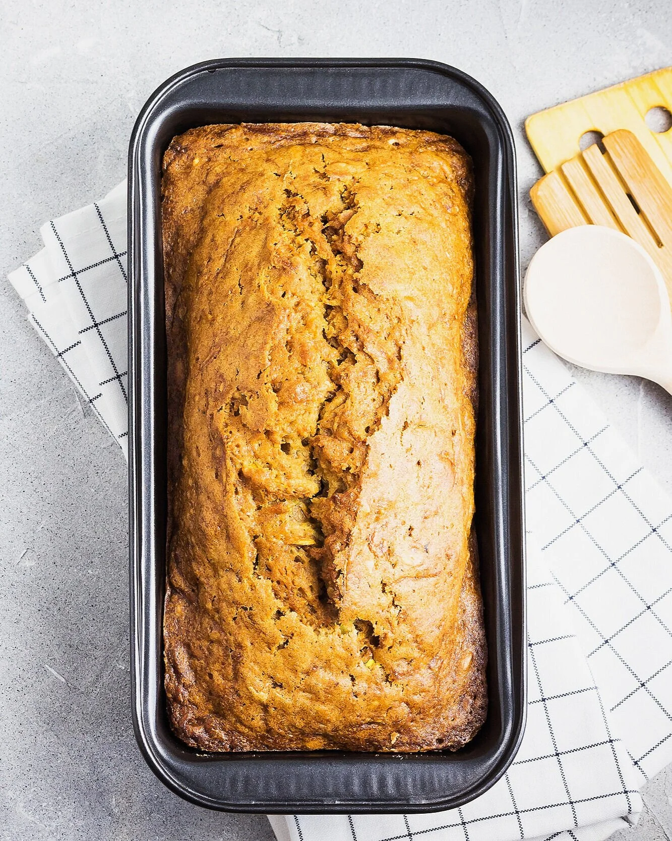 Pour batter into two greased medium-size loaf pans. Bake for 60-70 minutes, or until golden brown and set.